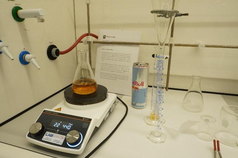 Initially students extracted caffeine from green tea, coffee and energy drinks. Samples of the chosen drink were treated with base to increase their pH and then the caffeine was extracted into dichloromethane. Separation of the water and dichloromethane solutions and boiling of the solvent gave pure caffeine.