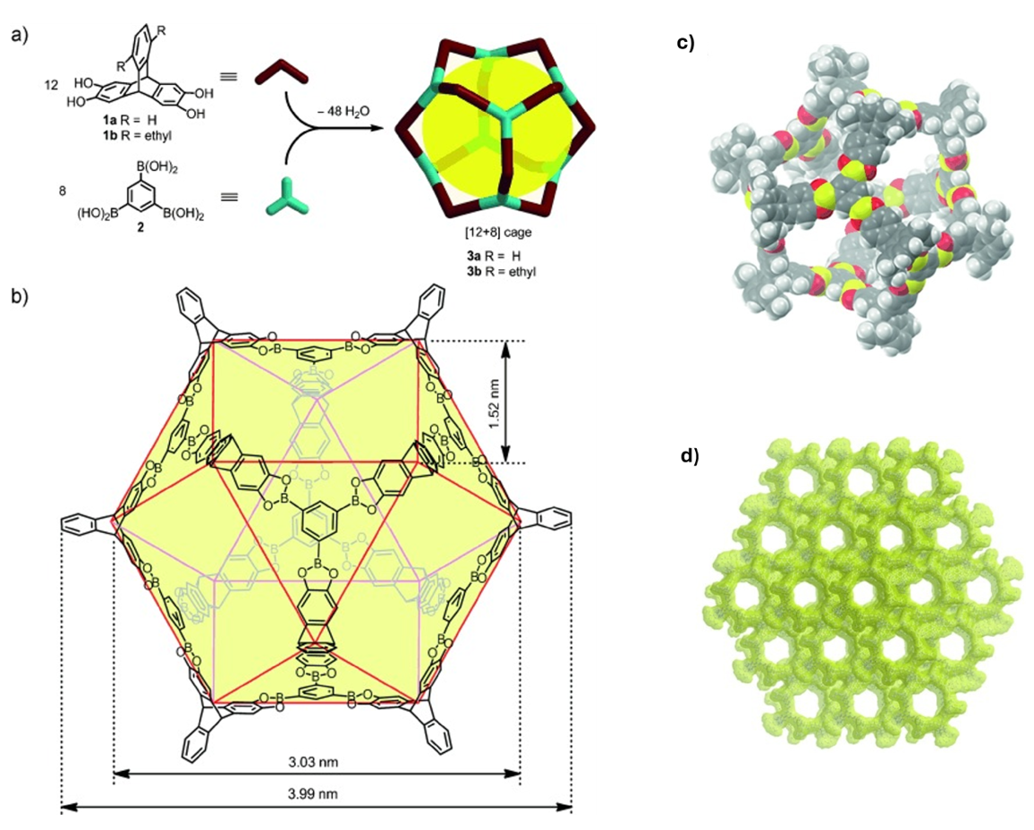 Fig. 6. a) One-step 48-fold condensation reaction of twelve molecules of triptycene tetraol 1 a or 1 b with eight molecules of the triboronic acid 2 to the cuboctahedral [12+8] cages 3a and 3b, respectively; b) the scaffold of the cuboctahedral cage, edges of the cuboctahedral geometry are highlighted in red; c) space-filling model, C gray, H white, O red, B yellow; d) packing in the solid state, yellow surface represents a solvent accessible surface with a probe radius of 1.8 Å. Reproduced with permission from reference 14.