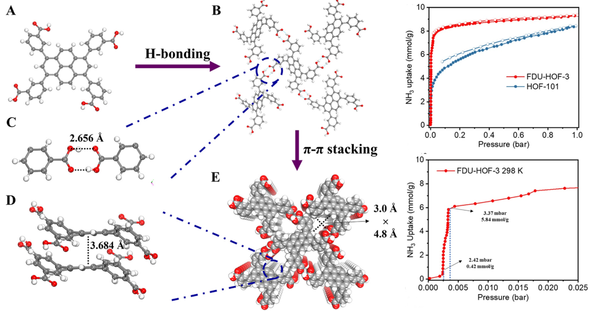 Fig. 9. Crystal structures of the FDU-HOF-3 (A) H4PTTB (3,3′,3‴,3‴′-(pyrene-1,3,6,8-tetrayl)tetrabenzoic acid) ligand. (B) H-bonds in the single-crystal structure of FDU-HOF-3. (C) H-bonds of carboxylate dimers in FDU-HOF-3. (D) π-π stacking in FDU-HOF-3. € The 3D structure of FDU-HOF-3. NH3 adsorption-desorption isotherms of FDU-HOF-3 and HOF-101 at 298 K (top) and NH3 adsorption at low concentrations for FDU-HOF-3 at 298 K (bottom). Reproduced with permission from reference 17.