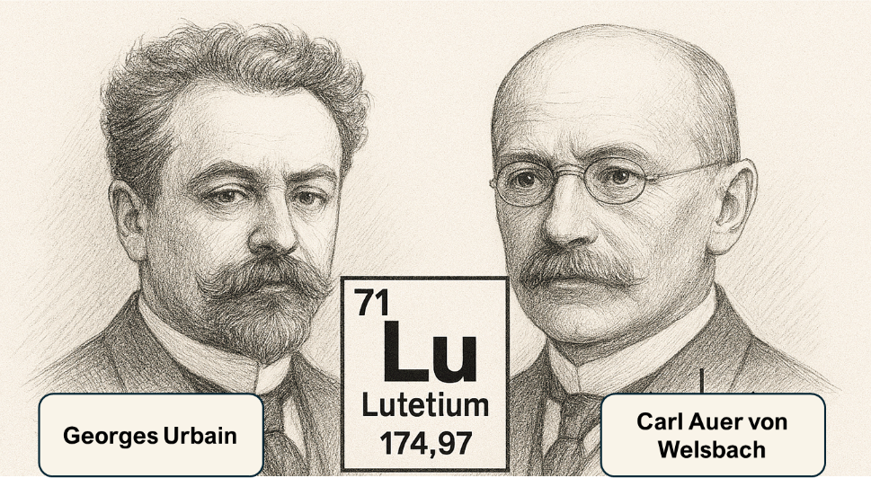 In 1907, French chemist Georges Urbain and Austrian mineralogist Baron Carl Auer von Welsbach (Fig. 1) independently isolated lutetium from the mineral ytterbia, a oxide crystal containing ytterbium oxide and lutetium oxide.10 Urbain named the element after 'Lutetia', the ancient Roman designation for Paris, with Welsbach proposing the name cassiopeium.10 Ultimately, the International Union of Pure and Applied Chemistry (IUPAC) adopted the name ‘lutetium' as a way to credit both researchers for their independent discovery of the element.10 Lutetium has 71 protons, and in its most abundant state, 104 neutrons. Lutetium-176, the only other naturally-occurring isotope of lutetium (2.5% abundance) is radioactive, decaying via beta decay (decay by releasing beta particles like electrons or positrons to be emitted from core) with a half-life of 3.7x1010 years.10,11 Lutetium behaves similarly to other lanthanides while also exhibiting transition metal behaviour, which is due to its filled 4f shell and a single 5d electron. This hybrid character explains much of its chemical versatility.