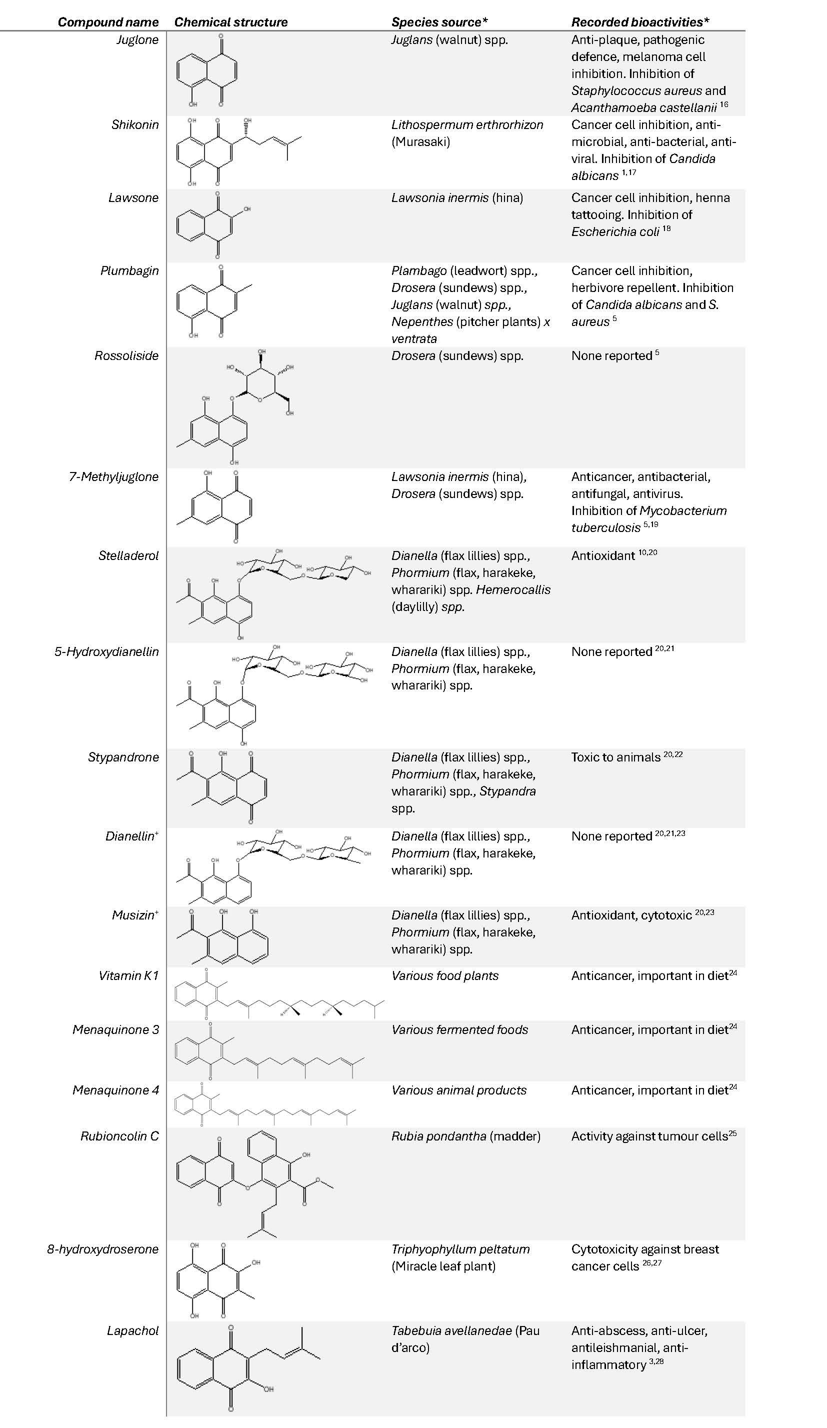 Table 1 (below). Structure, source and bioactivity of naphthoquinones, napthoquinol glycosides and related compounds from the literature cited in this article. * not an exhaustive list +1, 8 dihydroxynaphthalene compounds commonly isolated alongside the naphthoquinones and naphthoquinol glycosides